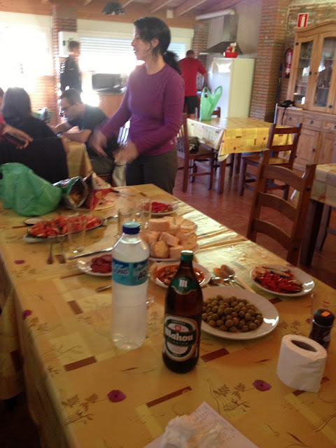 Ya que hoy hemos comido divinamente en el restaurante, apetece cenar un poco de variado en modo capricho: yo quiero esto, yo aquello, a mí me gusta más lo otro... :) Cada cual elegimos lo que más nos gusta. Volvemos al albergue a la sala común-comedor para compartir nuestra cena.